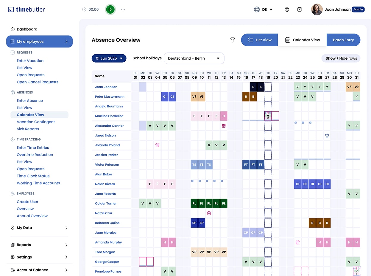 Yes, that’s right – besides tracking time and managing overtime, Timebutler makes it easy to handle all kinds of absences, like vacation, business trips, or sick leave. Everything is customizable and clearly organized, so there’s no need for manual spreadsheets. You can find more details here.