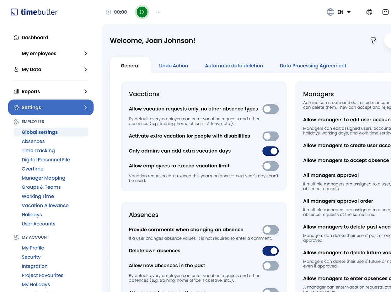Timebutler meets the highest EU data protection standards, keeping your employee data secure and your business fully GDPR-compliant.