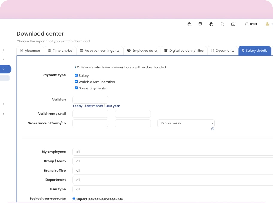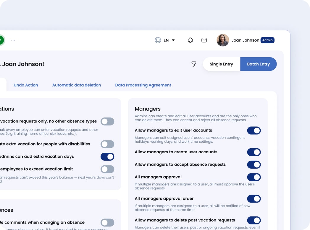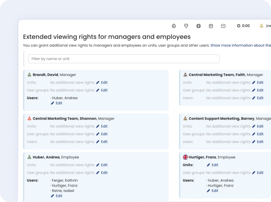 Timebutler takes data privacy seriously. Confidential info such as salaries, bonuses, or contracts is stored securely and kept separate from other records. You define who gets access, so only authorized people can view or change these details. This way, everything stays private, and your company stays fully compliant with GDPR.