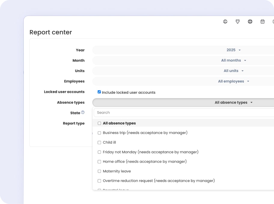 Need to find specific employee information quickly? Timebutler’s intelligent filters make it effortless. Find exactly what you need without flipping through paper files or Excel sheets. Plus, you can save searches, so recurring queries are even faster next time.