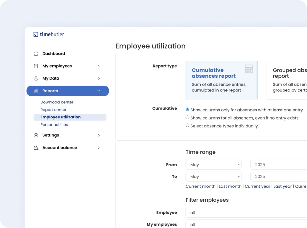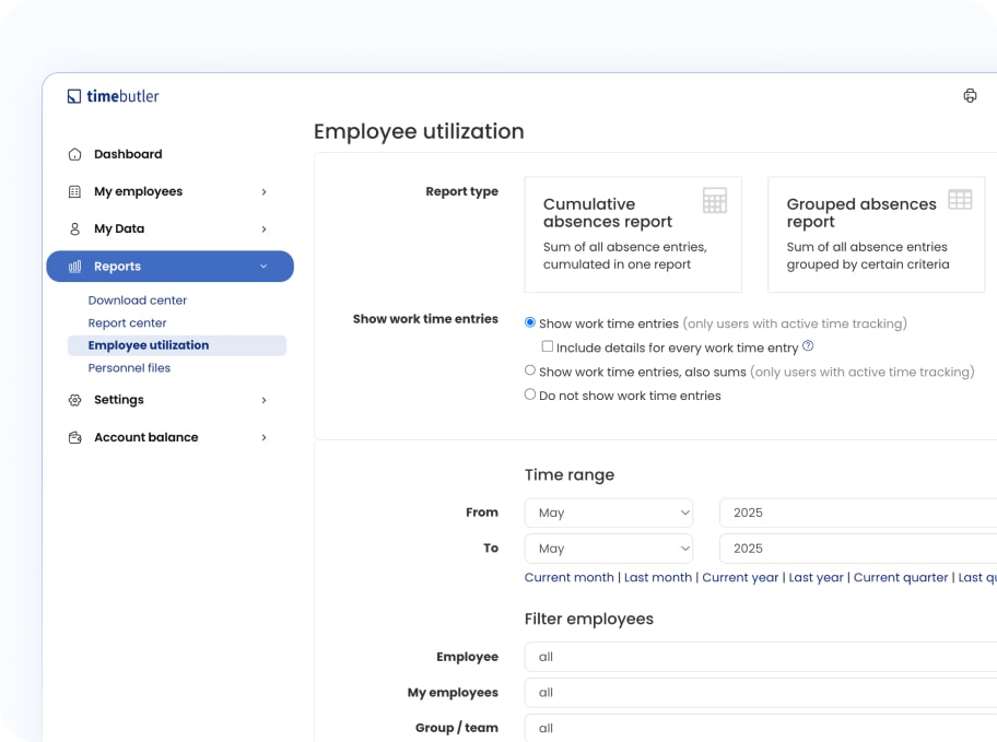 Yes, you have access to historical data in Timebutler . Our tool securely stores all recorded working hours and absences, so you can easily access historical data whenever you need it. You can generate reports retroactively which is perfect for internal reviews, follow-up questions from payroll, or spotting trends over time. Everything stays organized and easy to find.