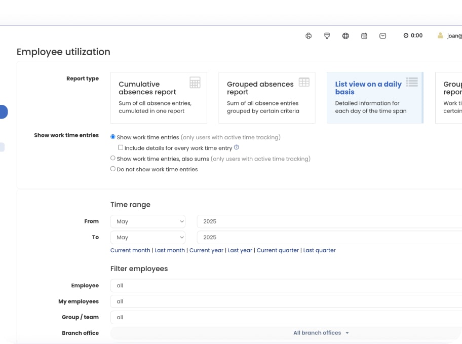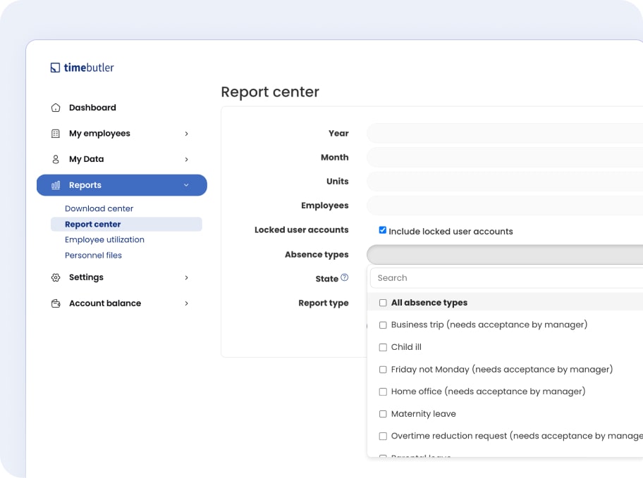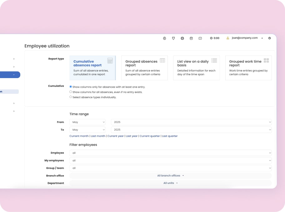 Yes, absolutely. In the report center, you can build reports based on exactly what you need. Choose what kind of data to include, like sick days, business trips, or other absence types – filter by day, month, or year. This way, you get clear, focused insights that match your workflow perfectly.