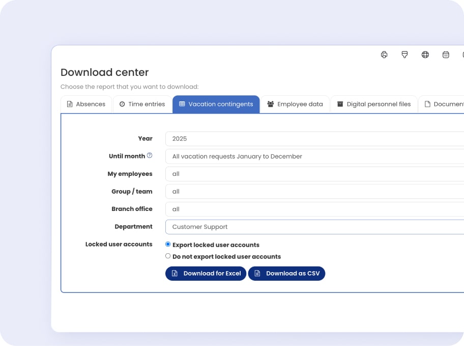 No more wasting time on tax and payroll compliance. Timebutler’s ‘Download Center’ allows you to export employee data, including absences, personnel files, and salaries, in the perfect format for tax reports and payroll — ensuring hassle-free compliance.