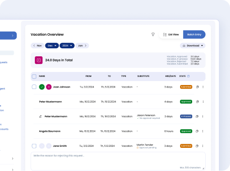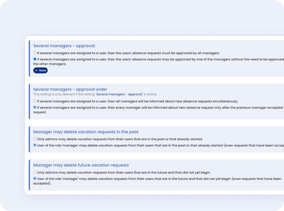 You decide how the approval process runs. Choose whether vacation requests need to be approved by one or multiple managers. You can also set up vacation blocks for critical periods or display warnings to avoid understaffing during peak times. That way, your team stays well-coordinated, even during busy project phases.