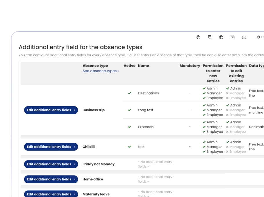 Create custom absence types for your team, complete with colors, abbreviations, and approval settings. Set editing permissions, annual limits, and more to match your company’s needs.