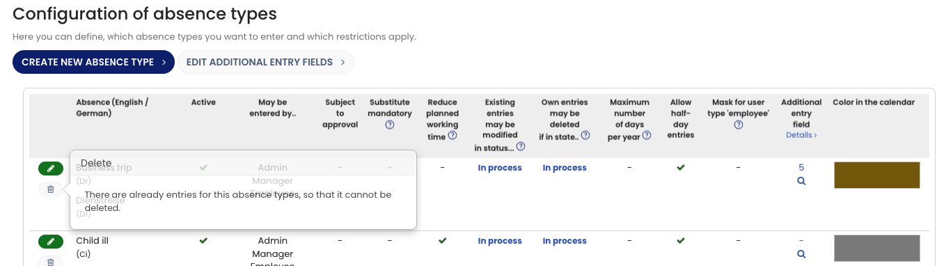 In this case, the absence type can be deactivated instead, which has almost the same effect as deleting it. Instructions for deactivation are provided below.