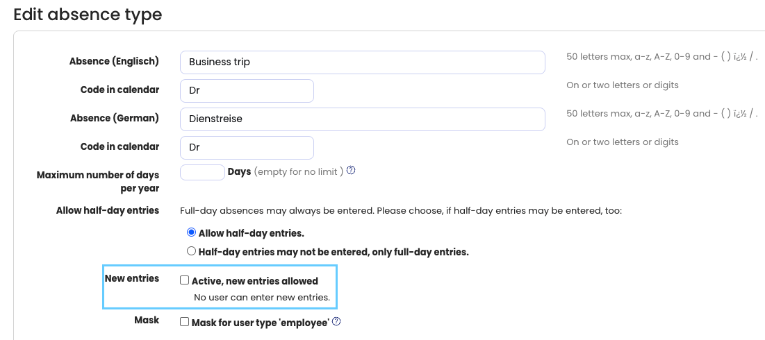 - Employees can no longer create new absence entries of this type.