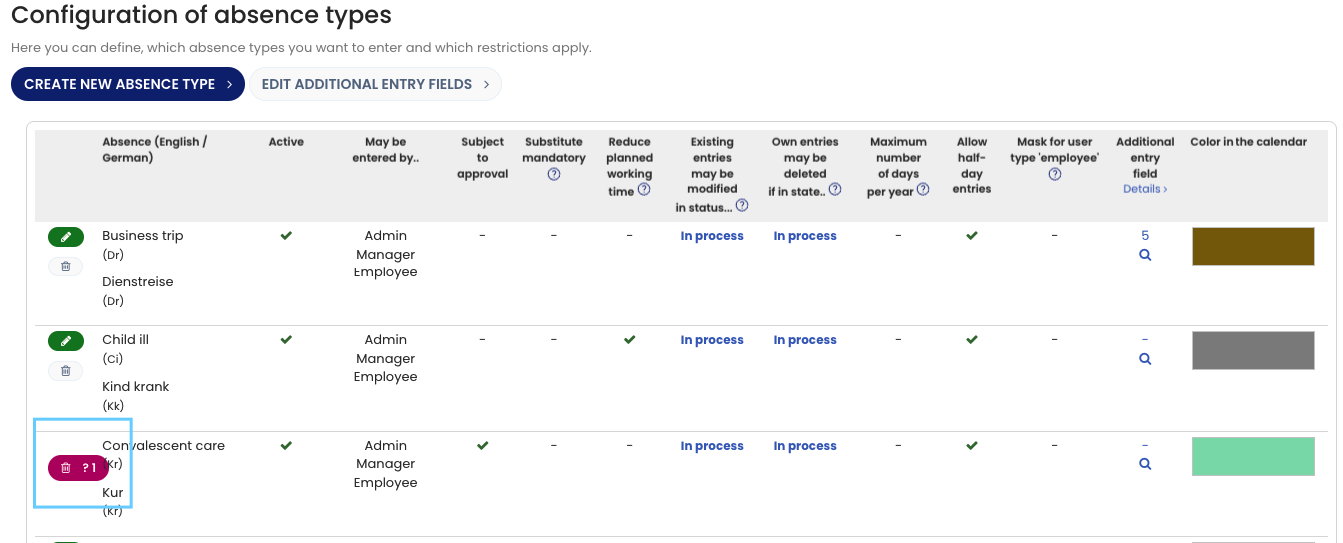 If you no longer need an absence type, or if you want to prevent employees from creating new absence entries of a specific type, you can delete or deactivate the absence type.