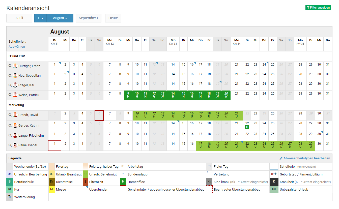 You can also enable grouping by department. Timebutler then groups employees by department and sorts employees alphabetically within each department.