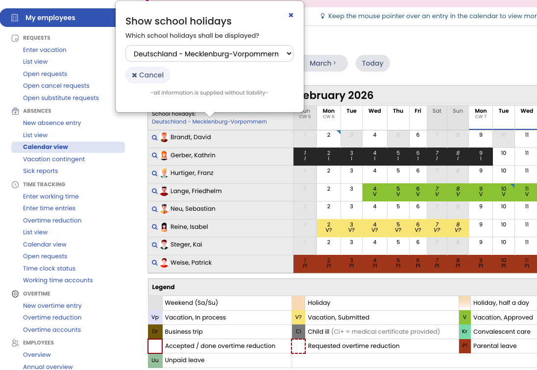 Each user can enable the display of school holidays in the calendar and choose from different available school holiday options.