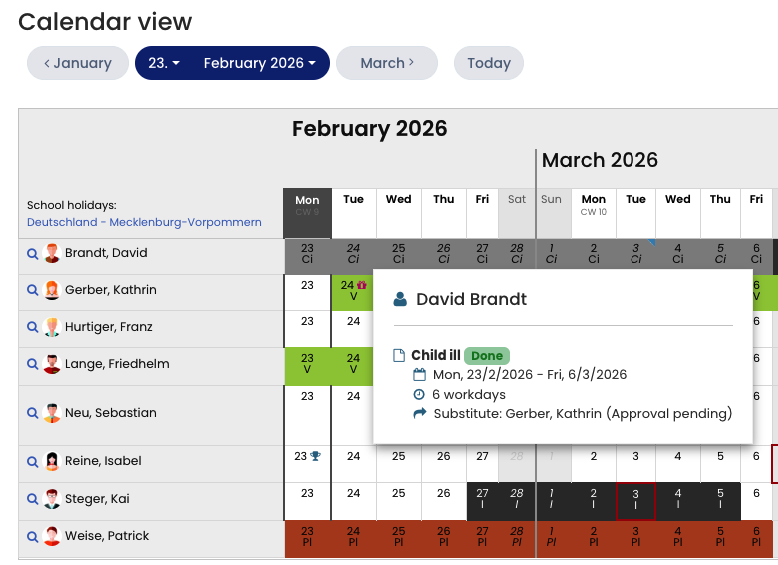 If you hover your mouse over an absence entry or a substitute marking in the calendar, a small information window appears with additional details about the entry and the substitute.