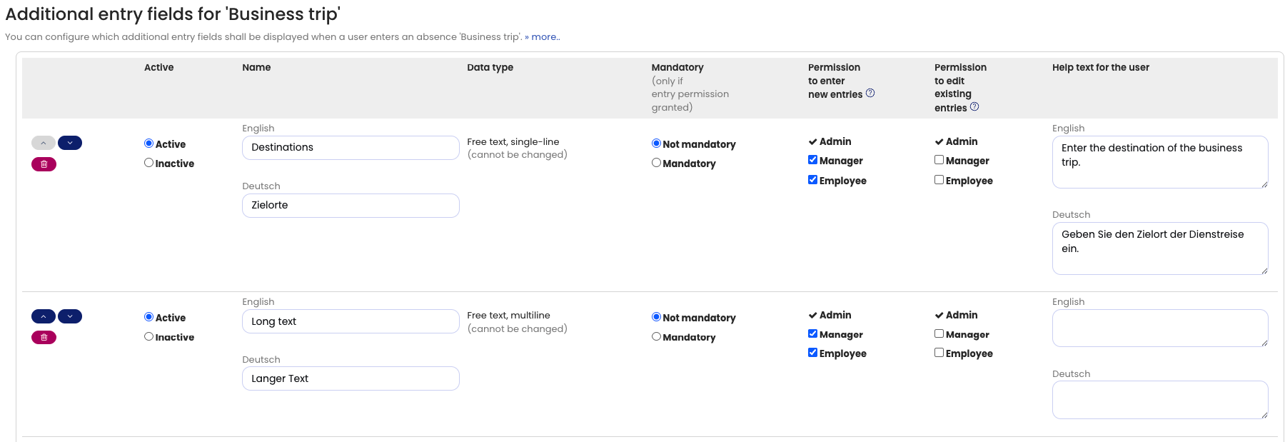 Using input rights and editing rights for custom fields, you can define whether Employee users and Supervisors are allowed to enter and edit custom fields for absence entries. Admins can always enter and edit all custom fields.