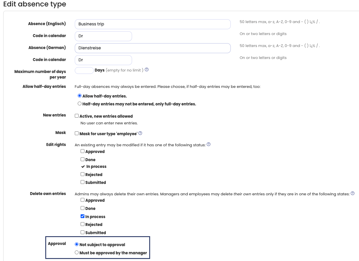 An admin can define for each absence type (for example, training, home office, business trip, etc.) whether it requires approval or not. This setting can also be applied to vacation.
