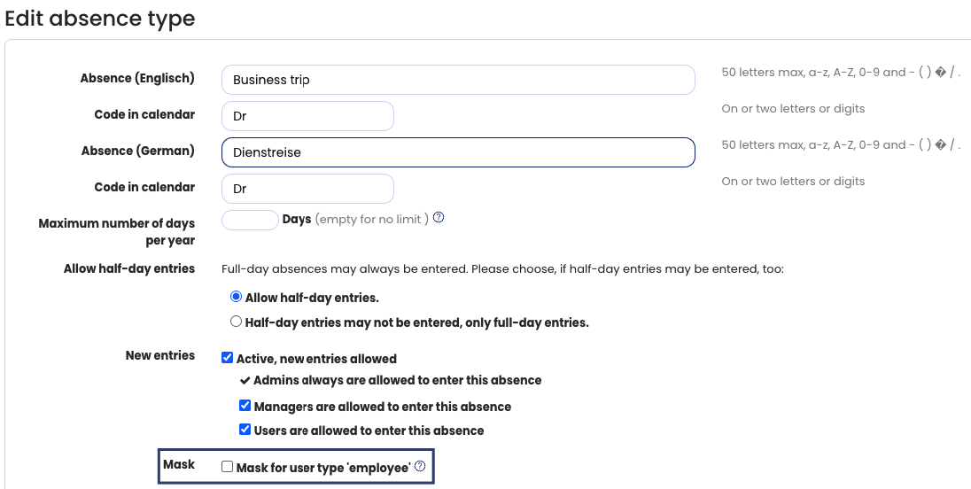 Masking can be configured individually for each absence type.