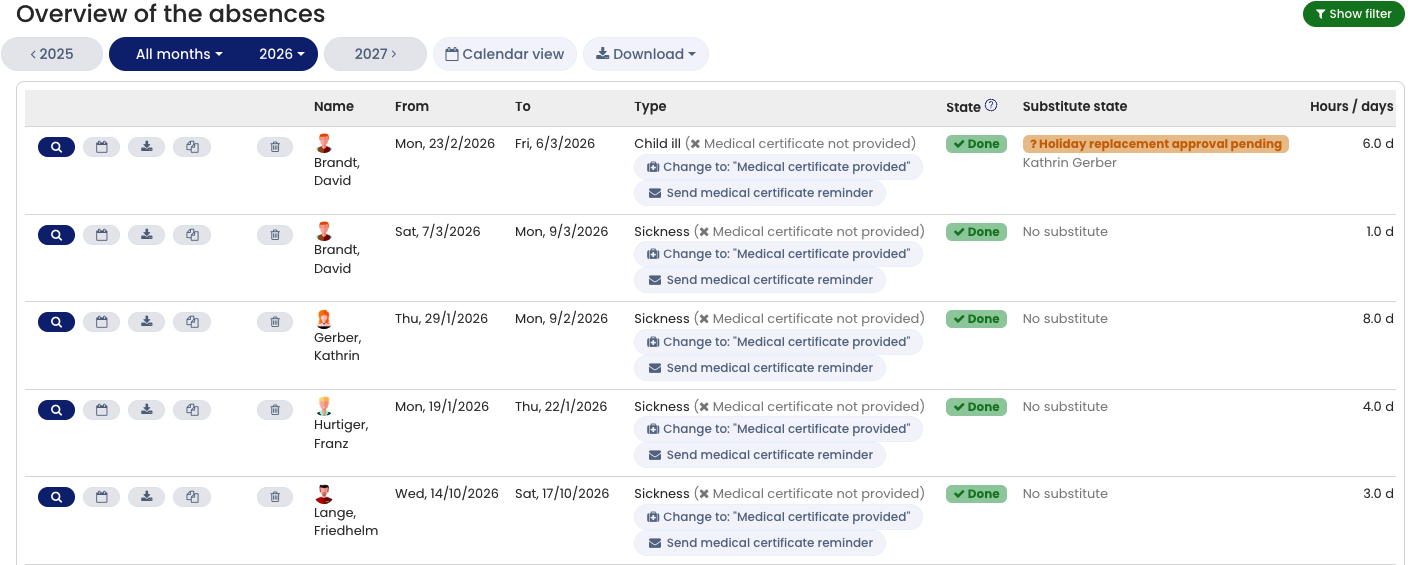 - In the list of sick leave entries, use the available buttons to update the medical certificate status.