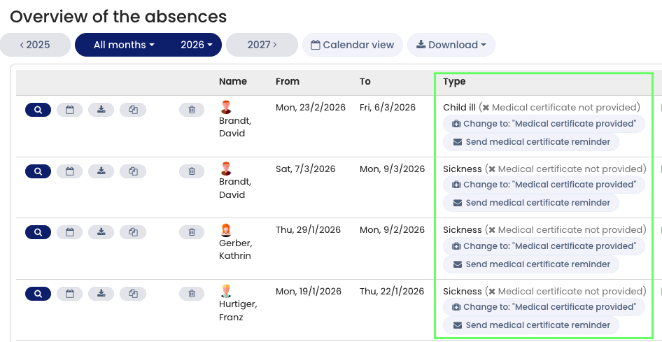 Timebutler allows you to send reminder emails to employees for sick leave entries where the medical certificate is still missing.
