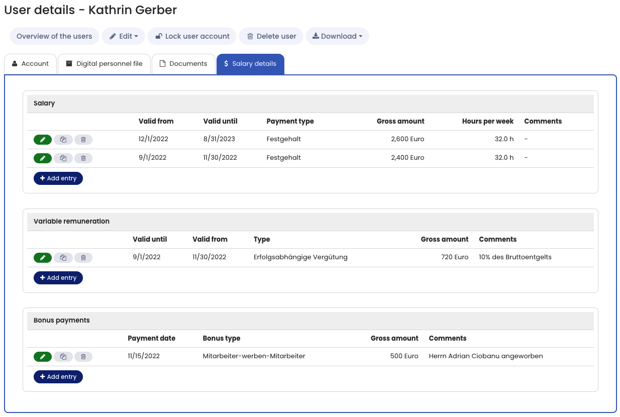 In addition to the Digital Personnel File, you can manage Salary information, variable compensation, and bonus payments for each employee.
