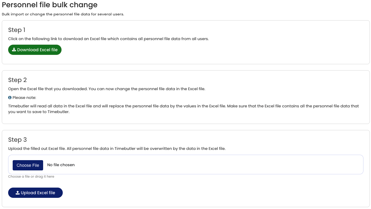 All fields of all Digital Personnel Files are overwritten with the values in the uploaded Excel file. After uploading, only the data contained in the Excel file will remain in the Digital Personnel Files.