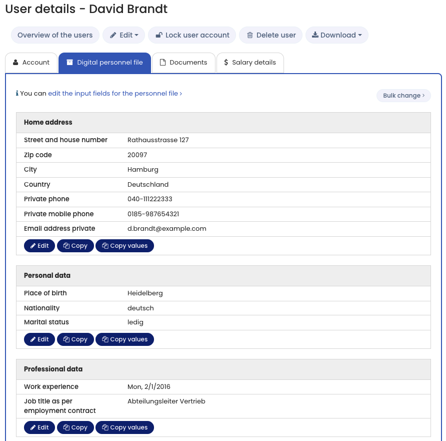 If you have the appropriate Viewing and editing permissions, you can edit data in the Digital Personnel File and Salary data as described below.