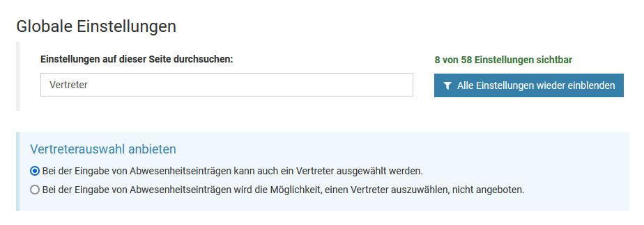 So check whether delegate selection is enabled. To do this, sign in to Timebutler with an admin user, click bottom left on “Settings > More..”, then on the right on “Global settings”. Here you will find the option “Offer delegate selection”.