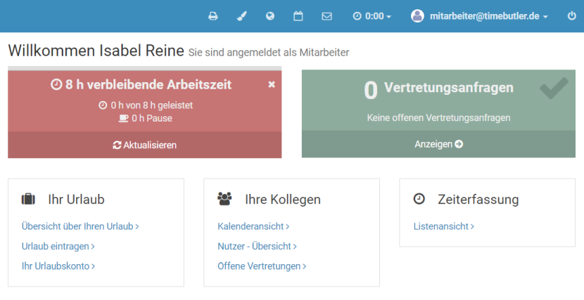 Right after you sign in to your Timebutler user account, you land on the dashboard - your cockpit with a clear overview of all relevant information on one page.