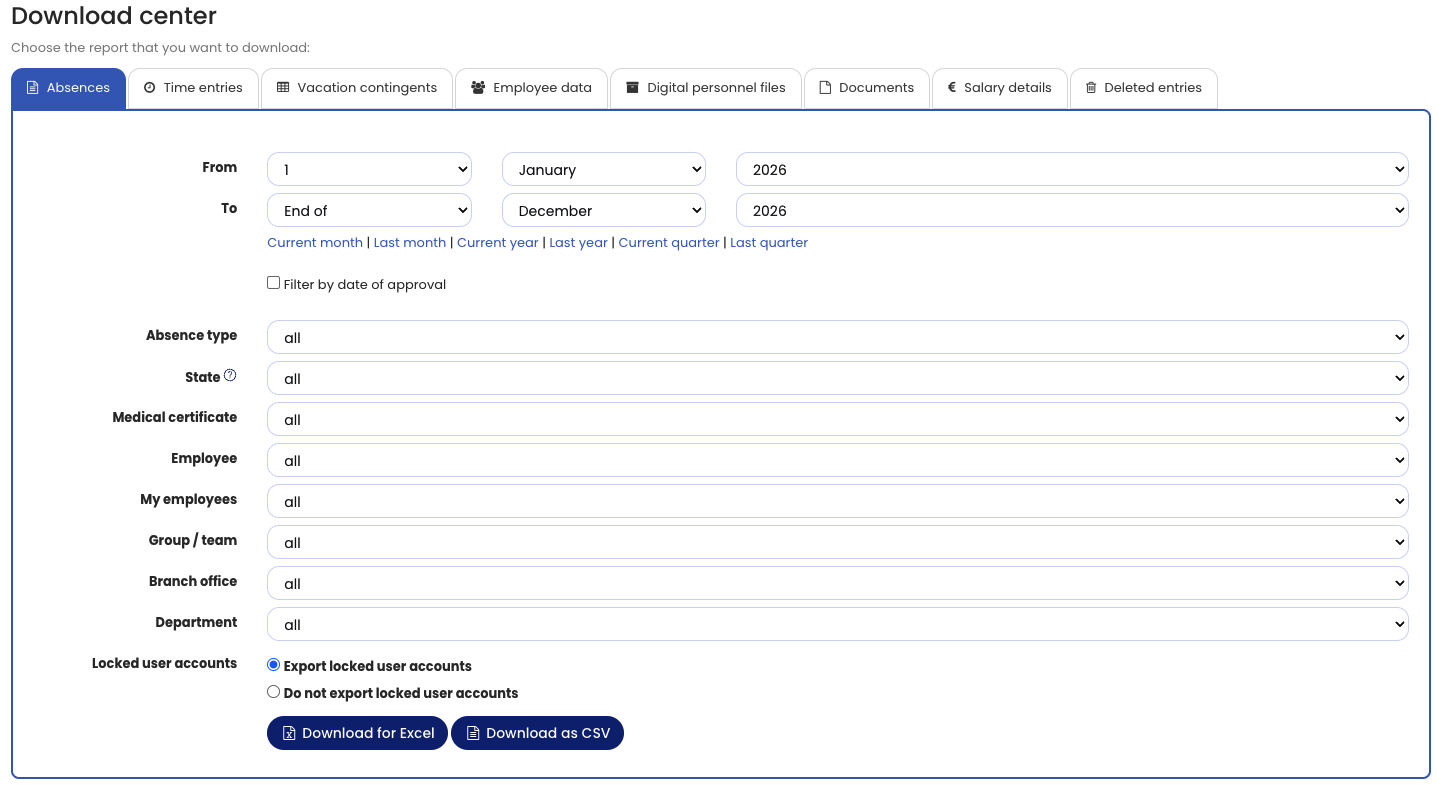 You can download employees’ absence entries via the Download Center as an Excel file or CSV file.