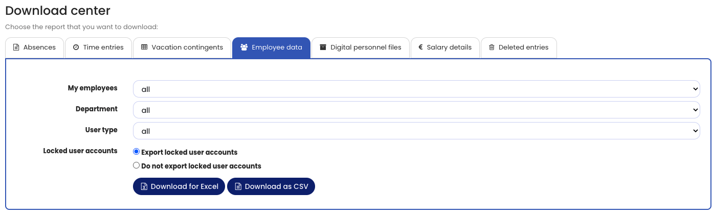 You can download employee data via the Download Center as an Excel file or CSV file.