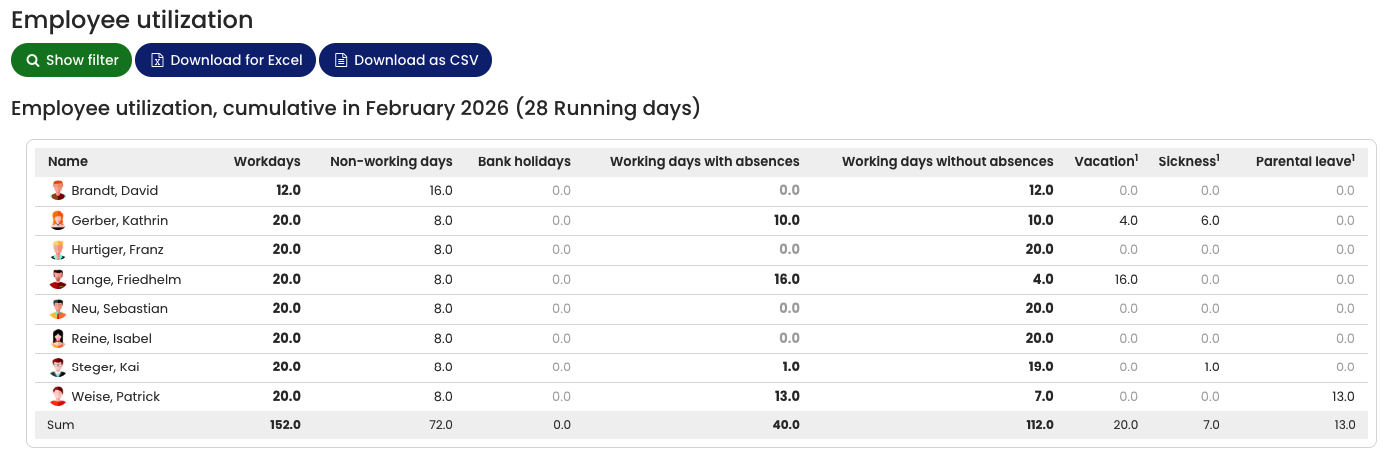 Example: If a vacation request starts in May and extends into June, and you generate the report for May, only the vacation days that fall within May are included.