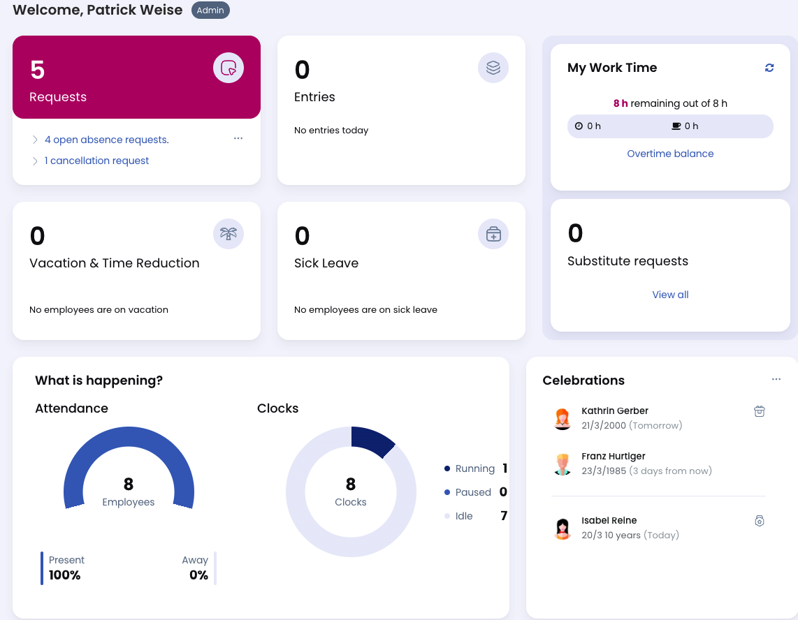 On the dashboard (the start page after logging in), Admins and Managers see upcoming birthdays and company anniversaries for employees they have viewing rights for.