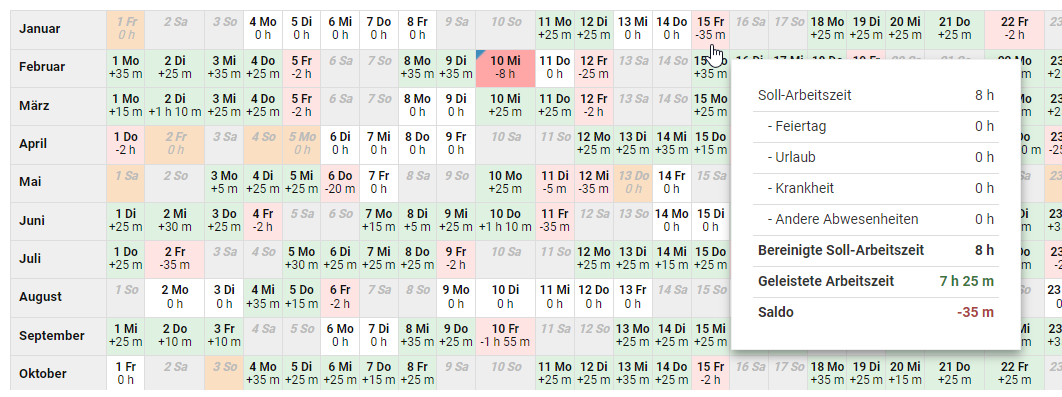 In the [calendar view of time entries(/time-tracking/calendar-view/open-the-calendar-view-of-working-time-entries/) you can display the detailed information for a calendar day. Hover your mouse over the calendar days to show additional information for each calendar day.