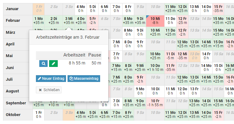 In the [Calendar view of working time entries(/time-tracking/calendar-view/open-the-calendar-view-of-working-time-entries/), you can view the working time entries for a calendar day and edit them. Click a calendar day with the mouse to open the working time entries for that day in a new window. In the window, you can open the details of the working time entry by clicking and by clicking