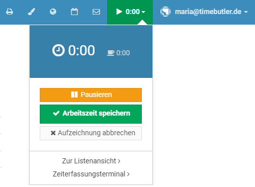 When the time clock is running or you are on a break, you can sign out of Timebutler, shut down the laptop/PC, or go to a client appointment. Timebutler continues to track working time in the background.