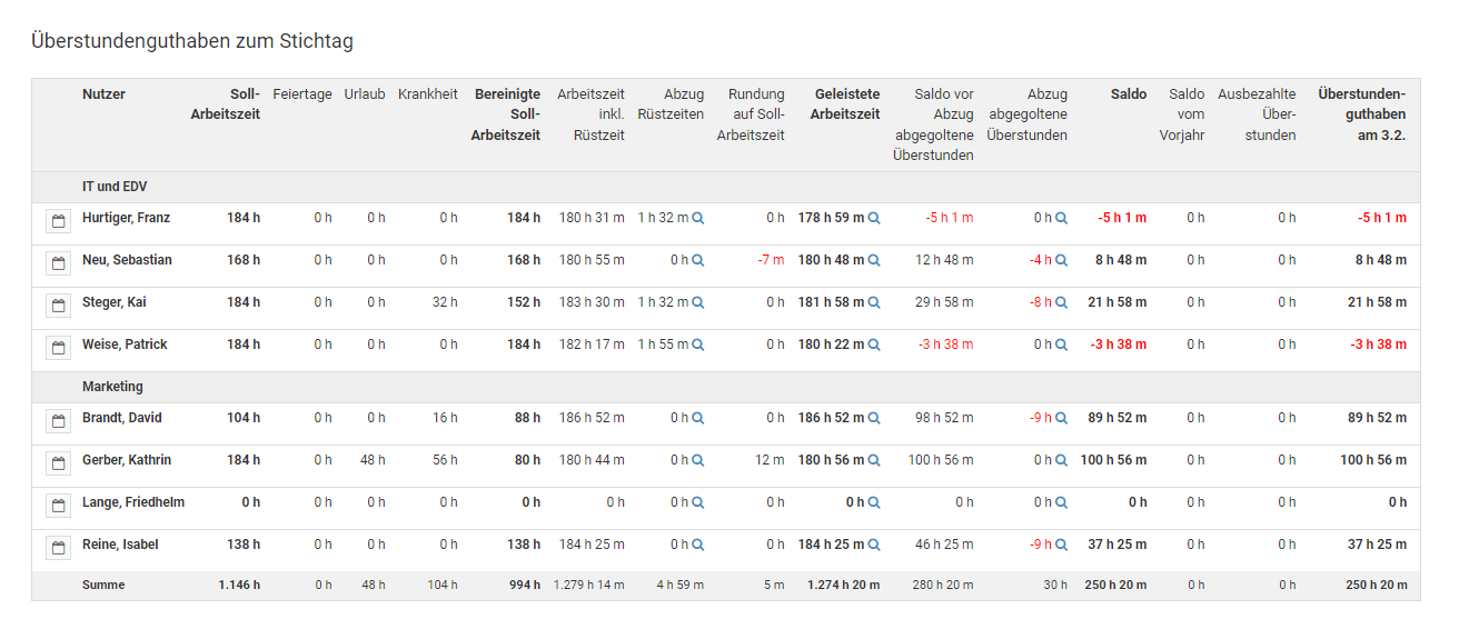 In the “Overtime balance as of the cut-off date” view, you can display how much working time was performed in a specific period. In the “Overtime status as of the cut-off date” view, you can display employees’ overtime status for any date. It also includes all historical data and the capping of overtime, rounding, setup times, and other reductions. Read here how to [open the working time account.(/time-tracking/working-time-account/working-time-account-overview/)