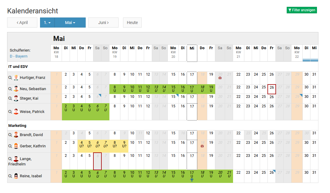 In the absences calendar view, you also see leave requests. You can easily recognize each leave request and absence entry by a colored bar.