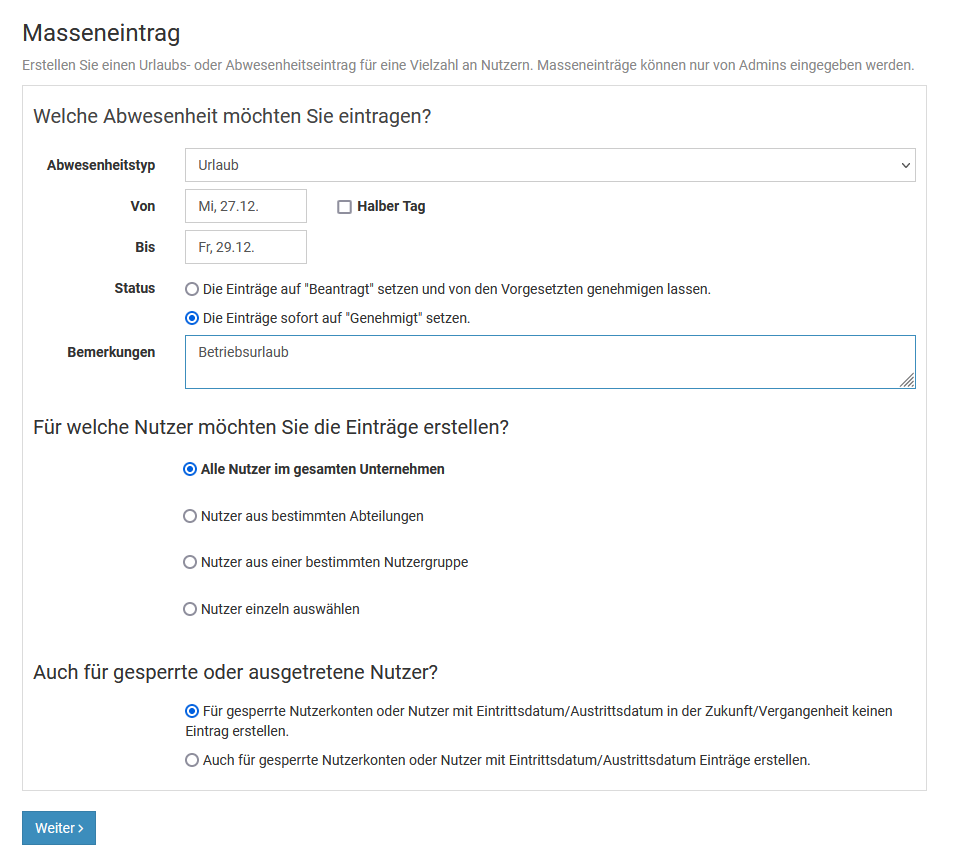 You can make the bulk entry for all employees, for employees in a specific department, for employees at a specific location, or for individually selectable employees. In the bulk entry you can also set the requests to “Approved” immediately, without requiring supervisors to approve them.