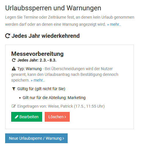 With leave blackouts and warnings, you define dates or periods during which employees can’t take leave or during which a warning appears. For example, if Sales should attend a business event together next year, you can set up a blackout period in advance to ensure that employees in Sales cannot request leave during that time.