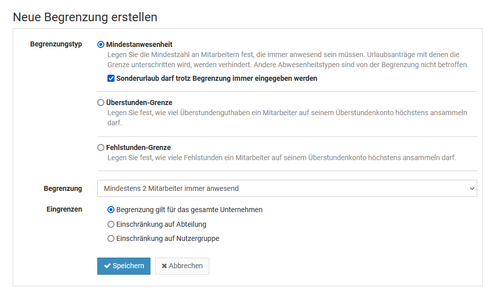 With limits, you can ensure that a certain minimum number of employees are available and that not too many employees from a department or [user group(/users-and-permissions/user-groups-and-teams/create-and-edit-user-groups/) are on vacation at the same time.