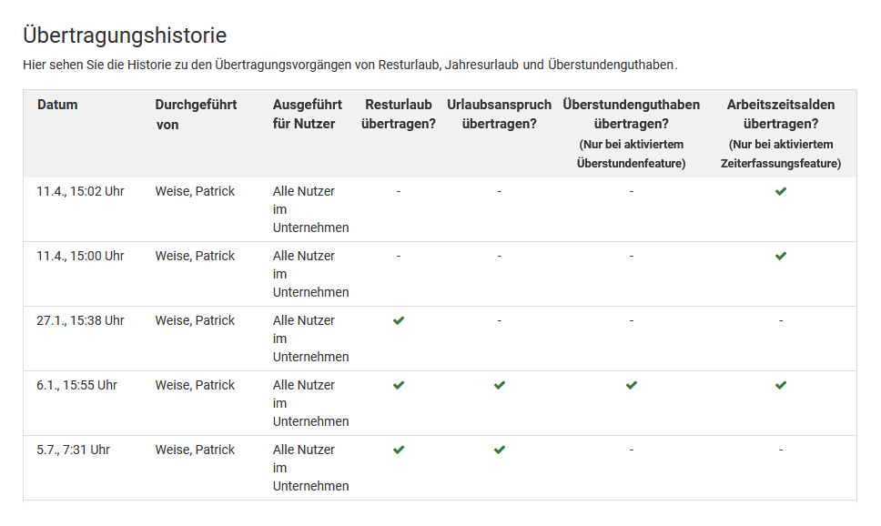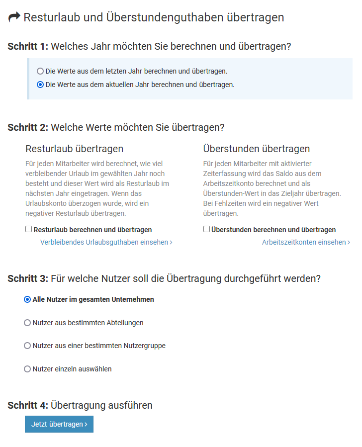 You can run the carryover as often as you like. You can run the carryover in November or December, and in any case again at the start of the year when vacation planning for the previous year is complete. Timebutler will automatically remind you about the carryover at the beginning of the year.