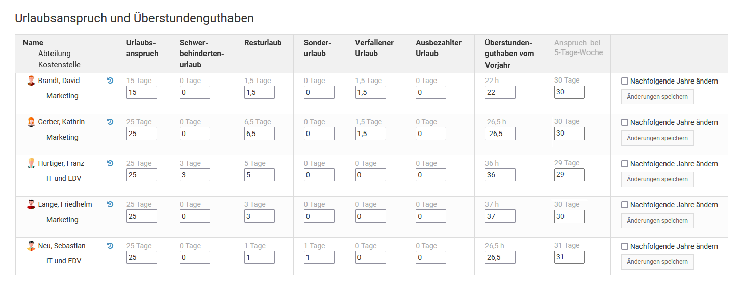 Sign in to Timebutler as an admin and click “Settings” at the bottom left, then click “Leave entitlement” underneath. Here you can change the values in the different columns and save.