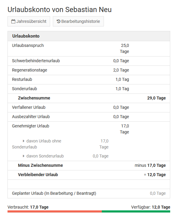 This results in the employee’s total leave balance for the year. Timebutler then subtracts the number of approved leave days, which yields the remaining leave entitlement.