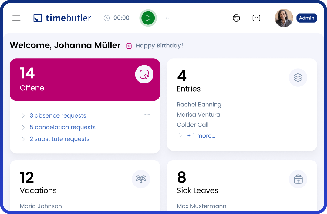 “As a non-profit organization, we face the challenge of keeping processes efficient. Timebutler has been a great help. We value having time tracking, vacation, and sick leave management in one tool. It simplified processes, gave a clear overview of absences, and its intuitive design saves time and reduces admin effort.”